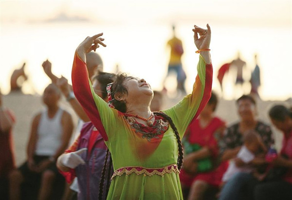 在三亚老年公寓入住的老人在三亚湾海边跳舞