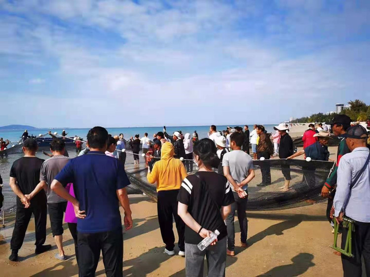正说着话,一群青壮年抬着厚重的渔网走来,他们是当地的渔民,今天上午要把渔网用船拖到海里下网,下午傍晚收网,据说三亚湾一带海洋资源非常丰富,一网下来可以捉上千斤海产品,爸妈说:“附近的客人到下午6点都来这里买刚打捞上来的海鲜,可便宜了,很新鲜”,哦,我还是第一次看渔民拉网扑鱼,以前可是只在书本电视上看到的,眼见为实,下午一定带老婆来三亚湾海边看扑鱼。